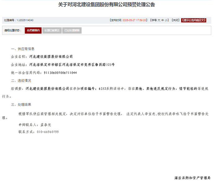 预警处理公告显示,对河北建设集团的违规情况为:经调查,河北建设集团在参加项目编号:6352采购活动中,存在“其他、其他违反规定行为,情节较轻的”等违规行为。
