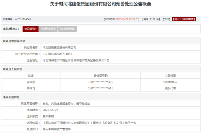 河北建设集团收军采预警,法定代表人李宝忠等被书面警告