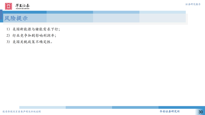 美国新能源与储能需求下行;行业竞争加剧影响利润率;美国关税政策不确定性。