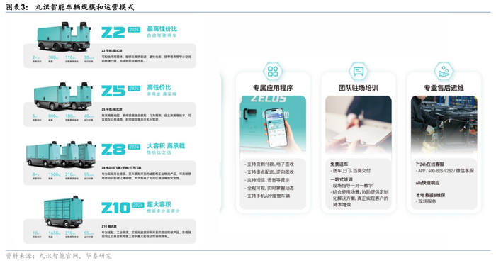 最新E系列起售价仅1.98万元,产品矩阵完成从单一产品到多平台布局。公司当前产品主要有Z系列和E系列两个平台,其中Z系列已发布4款车型,根据车型大小裸车价格从3.98-8.98万元不等。2025年5月27日,九识智能发布全新E系列无人物流车平台及首款车型E6,相较于Z系列“全能型”定位,E系列更强调“专精化”,针对特定场景进行定制化优化。E平台首款车型E6专为轻件散件物流场景打造,载重低体积大,硬件售价1.98万,FSD服务费1800元/月。