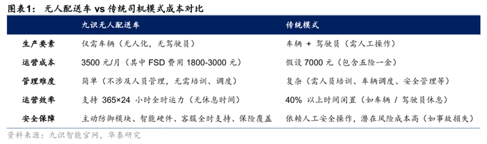 2)Robovan可为客户实现显著降本,商业模式初步跑通。以九识无人车为例,与传统司机模式相比,无人配送车可以节省成本:①生产要素中去除驾驶员,直接节省人工工资,同时避免人员管理的间接成本(培训、调度、考勤等)。②无人车可全时运营(365×24 小时),相比传统车辆 40% 以上时间闲置,大幅提升车辆使用效率,分摊单位运力成本。