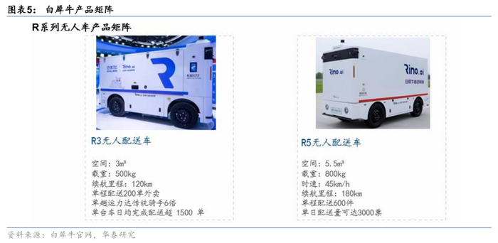 主打“高性价比无人配送服务”,目前有R3和R5两款无人配送车型。白犀牛车型采用车规级传感器与高算力域控制器,搭载BEV算法方案,配送效率相当于3-5 名配送人员,单次载货量可达100包药品或生鲜货物,相当于10-15人人力。公司的业务模式是软硬件+商业化运营,不直接出售车辆只是运营自己的无人车。2025年4月11日,白犀牛与饿了么达成战略合作,聚焦于校园外卖配送场景。双方将率先在校园场景规模化落地无人配送解决方案,以 L4 级自动驾驶技术重构校园外卖配送体系,预计首期将覆盖全国 100 所高校。