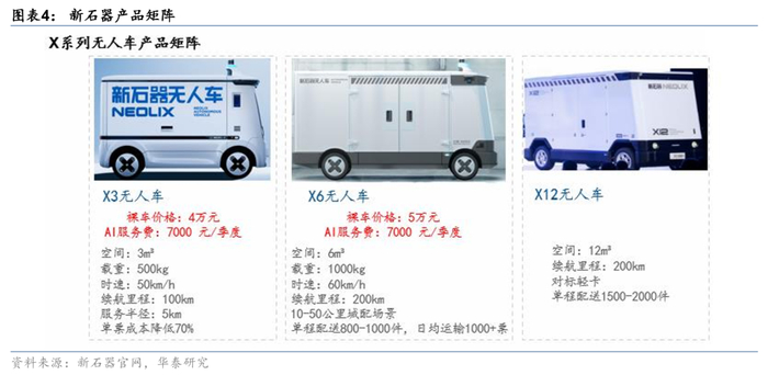 1)硬件成本指数级下降。新石器X3车型通过5代迭代从20万元降至7万元,九识智能E6车型裸车价低至1.98万元,较初代降价91%。