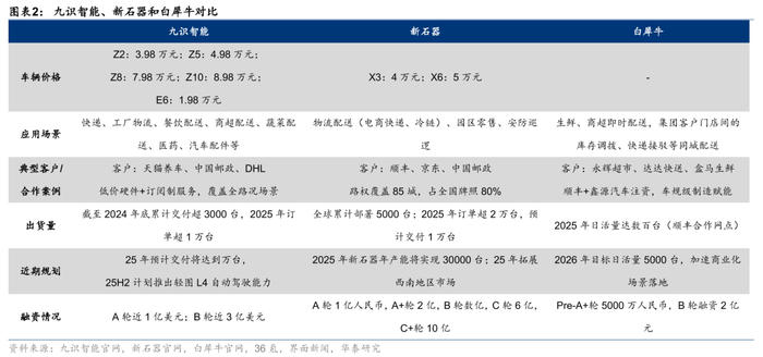 3)规模扩张条件成熟,头部玩家在融资/产能等方面快速扩张。九识智能已完成近3亿美元B轮融资;新石器建成万台级智造工厂,2025年目标交付超2万台;白犀牛2026年目标日活量5000台。
