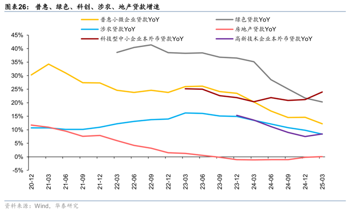 高质量发展导向下,“五篇大文章”成为转型发展重要方向。在目前更加注重信贷投放效率、支持高质量发展的导向下,央行强调继续围绕“五篇大文章”,引导更多信贷资源流向重点领域和薄弱环节。2021年以来,普惠、绿色、科创等信贷步入快速增长周期,2025Q1末金融机构绿色贷款、普惠小微贷款、涉农贷款增速分别为20.3%、12.2%、8.4%,在前期高基数下增速有所下滑,但仍优于各项贷款平均。科创支持力度持续加码,2025Q1末科技型中小企业贷款、高新技术企业贷款增速分别为24%、8.5%,增速边际提升。长三角、珠三角等经济发达地区作为全国高质量发展的标杆区域,加大政策倾斜力度率先布局未来产业赛道。强化区域创新发展优势的同时,也为当地银行业金融机构创造了优质的信贷投放机遇。
