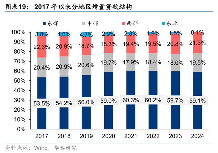信贷资源呈现明显的区域分化特征,经济发达的东部地区占据主导地位。从银行存量信贷资金分布看,东部地区占比持续提升,由2017年末的55.5%提升至2024年的57.1%;新增信贷贡献来看,东部地区由2017年的53.5%提升至2024年的59.1%。在政策驱动下,2020年以来银行信贷资源向中西部投入有所加大,2024年新增贷款中,中部地区、西部地区分别占比19.5%、21.3%。