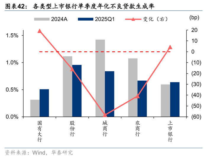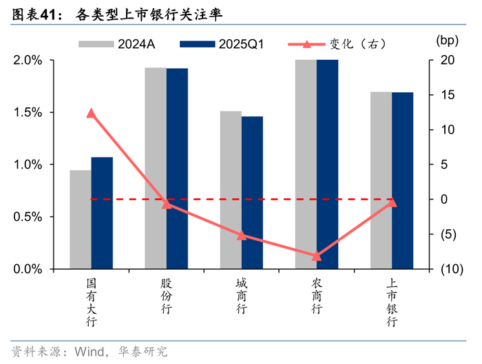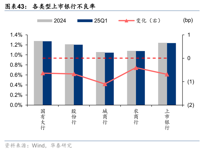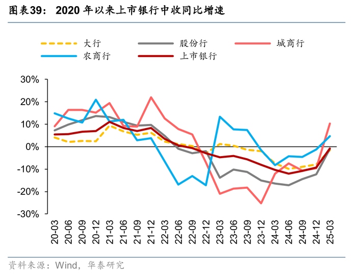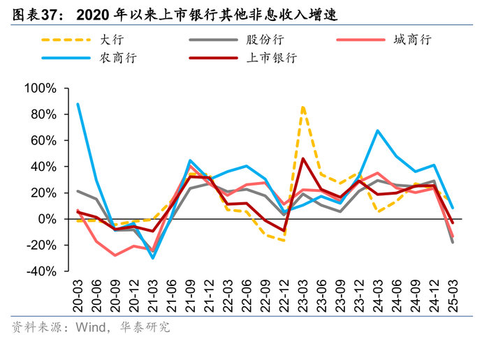 高基数压力下,银行其他非息收入增速或下行。一季度债市大幅调整下,上市银行投资类收益波动较大,拖累业绩增长。上市银行25Q1其他非息同比下降3.2%,较2024A的高基数下降28.9pct。其中股份行、城商行回落幅度相对更大。展望后续,预计债市利率步入持续震荡区间,在去年较高基数影响下,预计银行其他非息收入增长较有压力。