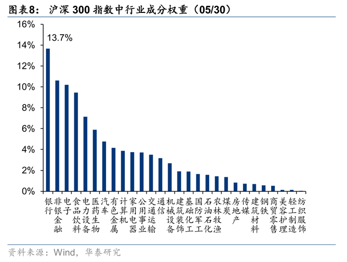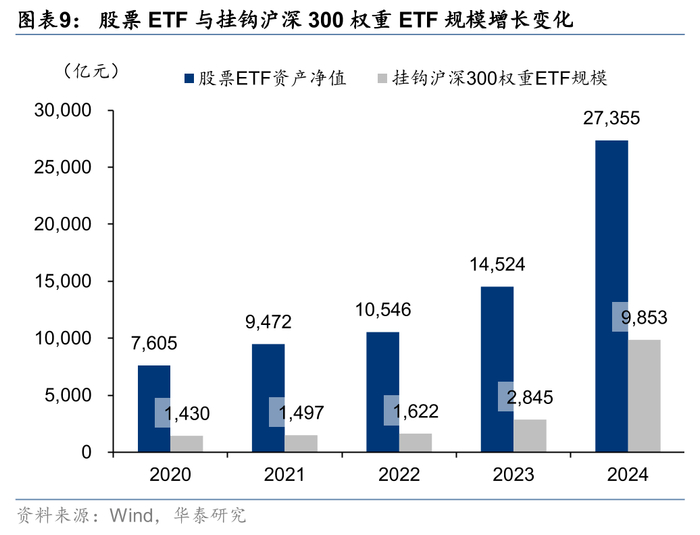 以沪深300为代表的宽基指数为主要增量贡献,银行板块权重占比较高,有望受益扩容。截至24年末,3.7万亿元的ETF市场中,宽基产品(规模指数型)达2.2万亿元,占比59%,相较年初提升18pct,是本轮ETF增长的核心力量。以沪深300为例,2024年挂钩沪深300权重的ETF规模增长7008亿元至9853亿元,增量占2024年股票ETF资产净值规模的55%。而银行板块在沪深300等核心指数中权重占比较高,为13.7%,有望受益于被动资金持续扩容。