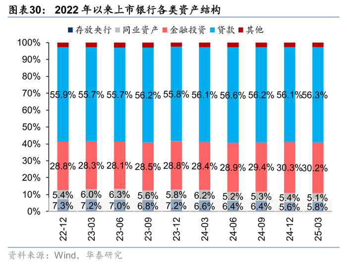 预计上市银行信贷有望延续稳健增长,金融投资资产增速下行。一季度上市银行贷款增速整体平稳,量上同比多增。虽零售复苏节奏仍待观察,且4月以来关税政策反复下不确定性增加,但考虑到银行贷款大部分集中在年初投放,一季度为全年奠定了较为稳定的基础,预计全年信贷增长保持稳健。非信贷部分资产配置结构或有调整。去年在债市行情下,银行金融投资资产保持较高增长,在总资产中的占比由23年底的28.8%提升2pct至24年底的30.3%。年初以来债市大幅回调,我们认为后续仍将延续震荡,预计银行金融投资资产在前期高基数下增长将有所放缓。