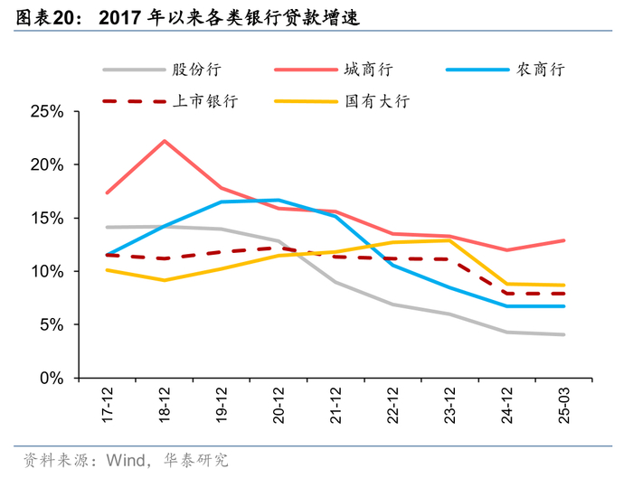 经济发达地区优质城商行贷款增速韧性较强。近年来经济持续波动下,零售、小微部门受冲击较大,股份行、农商行信贷增速明显下滑;2023年在均衡信贷投放、打击资金空转政策导向下,大行信贷增速亦有下行。而优质地区旺盛的信贷需求支撑区域银行保持较强扩表力度,近年来城商行贷款增速持续高于各类型银行。25Q1城商行贷款同比增速12.9%,为各类银行中最高;近年来城商行贷款份额稳步提升,25Q1末在上市银行总贷款中占比7.9%。