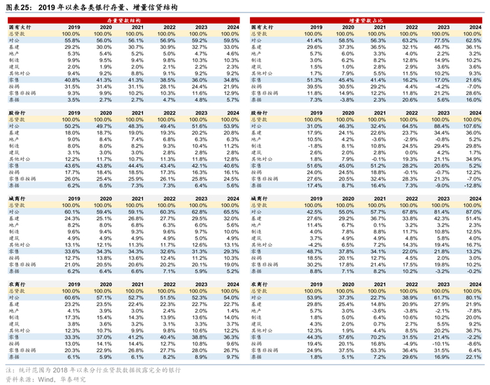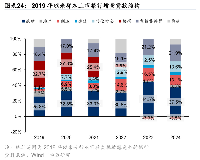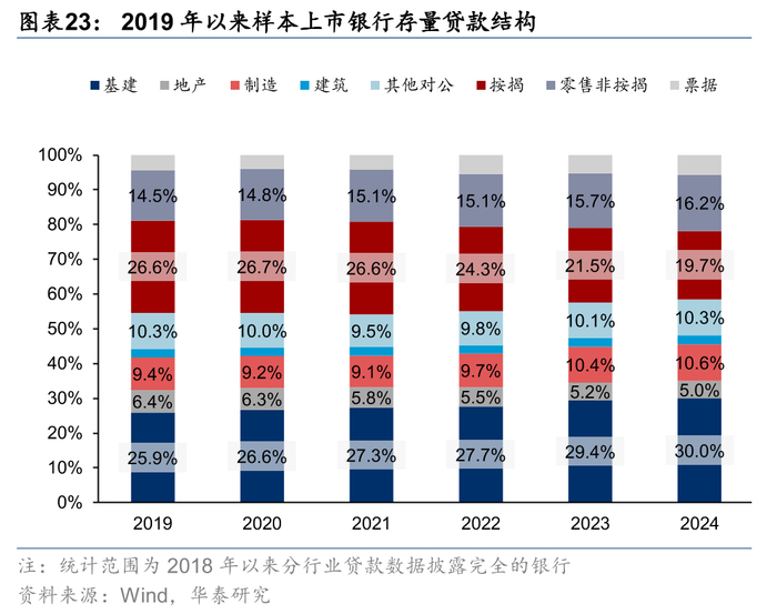 涉房类信贷增长放缓,基建类、制造业等贡献持续提升。房地产行业调整叠加消费复苏偏缓,实体部门信贷需求仍待修复。2019年以来上市银行贷款结构中按揭、对公地产增长较为承压;基建类贷款成为信贷增长重要支撑,占比稳步提升;此外,高质量发展导向下,高技术制造业等逐步发力,成为信贷结构转型重要方向,制造业贷款贡献也逐步提升。2024年末上市银行存量贷款结构中,基建类、制造业、对公地产、按揭占比分别为30.0%、10.6%、5.0%、19.7%,在当年新增贷款中占比分别为37.5%、13.1%、3.3%、-3.5%。展望后续,经济稳步复苏及结构转型过程中,预计政府主导的重大项目、“三大工程”以及新基建领域将持续稳固银行信贷基本盘,与此同时,“五篇大文章”所聚焦的战略性新兴领域将成为银行业信贷投放的重要增长极。