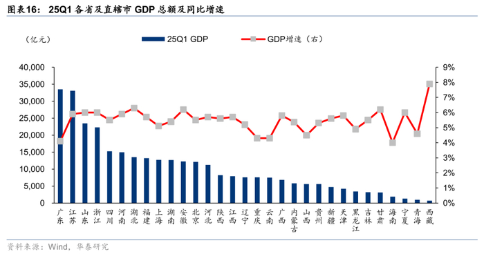 经济大省挑大梁政策导向下,优质地区经济持续保持领先态势。2025Q1广东、江苏、山东、浙江、四川仍为GDP总量前五省份,贡献全国经济总量约40.3%。优质地区经济持续领先,为信贷需求提供了较强的内生动力。如江苏、浙江、山东、四川等信贷增速持续领先全国平均,除传统基建、制造业等领域融资需求旺盛外,绿色金融、科技创新等新兴领域的信贷规模也在快速扩张。今年全国两会上,习近平总书记再次强调,圆满实现“十四五”发展目标,经济大省要挑大梁。经济发达省份凭借完善的产业链基础、活跃的市场主体和优越的营商环境,在固定资产投资、科技创新投入和消费市场培育等方面均展现出强劲韧性,稳担“挑大梁”重任。