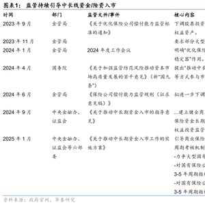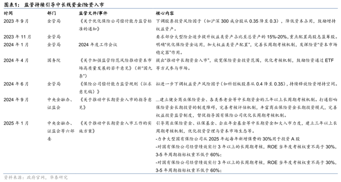 监管多措并举推动中长期资金入市,险资为权益市场未来重要增量。2023年9月金管局下调股票投资风险因子,降低险资配置成本;同年11月窗口指导要求部分险企提升权益占比2024年新"国九条"明确推动中长期资金入市,险资持续加码,25年1月六部门发布《关于推动中长期资金入市工作的实施方案》,提出提升商业保险资金A股投资比例与稳定性,如推动超1000亿元保险资金长期股票投资试点在2025年上半年落实到位,后续逐步扩大参与机构范围与资金规模,此外力争大型国有商业保险公司从2025年起每年新增保费的30%用于投资A股。《方案》中暂未明确新增保费的口径,若分别以人保、人寿等5家大型保险公司2024年新单保费和业务现金流入计算,测算每年入市增量资金分别为3662亿元和1912亿元。