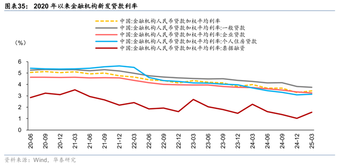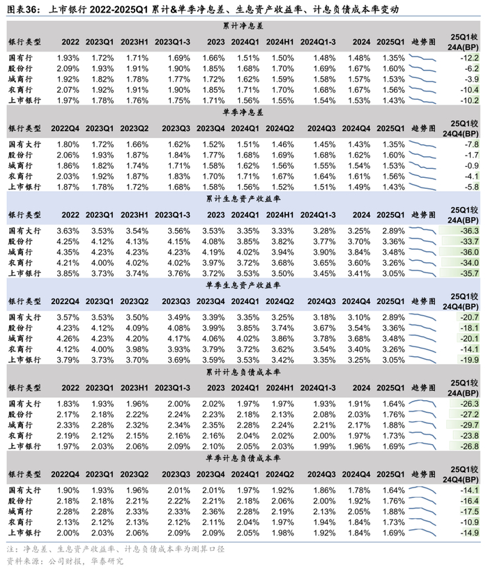 定期存款迎集中重定价周期,驱动息差降幅收窄。随存款逐步迎来到期重定价高峰,挂牌利率下调利好加速释放。由于存款到期重定价有一定的时滞,负债端成本改善效应有所滞后。上市银行定期存款中三年期为主,22年起吸收的大量定期存款或将在今明年迎来到期高峰,银行负债端成本已逐步迎来改善周期,测算25Q1上市银行累计付息负债成本率为1.69%,较2024年-26.8bp,驱动息差降幅收窄。资产端,新发贷款利率降幅减小。25Q1金融机构贷款加权平均利率3.44%,较24年略回升16bp,其中一般贷款利率、企业贷款利率、个人住房利率、票据融资利率分别环比-7bp、-8bp、+4bp、+53bp。综合资负两端,我们预计银行息差降幅有望逐步收窄。