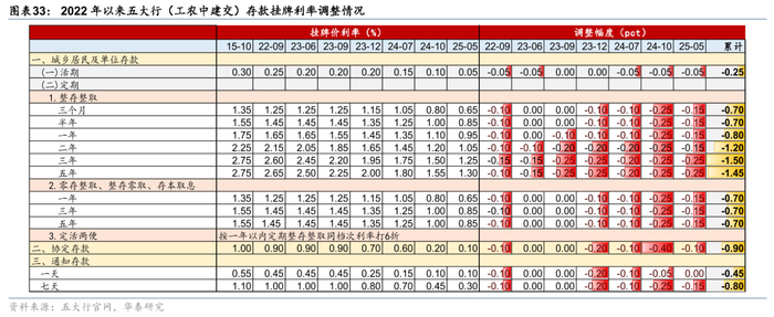 央行呵护银行息差意图明确,多措并举优化银行负债端成本。央行去年以来多次公开场合表态呵护银行合理息差与利润空间,资产端利率调整上较为谨慎,负债端成本优化政策密集落地。一方面存款挂牌利率调降频率、力度明显提升,22年9月以来大行已7次主动下调存款挂牌利率,活期/1年期/3年期/5年期累计降幅分别达25bp/80bp/150bp/145bp。且近期LPR下调后存款利率往往快速跟进调整,体现对银行息差的呵护与重视。如5月20日年内首度下调LPR10bp后,当日大行宣布下调存款挂牌利率,且降幅明显更大(活期、3个月-2年期、3-5年期存款利率分别下调5bp、15bp、25bp)。另一方面,调控方式愈发多元化,压降高成本负债的举措从零售端逐步向企业端、同业端扩展。