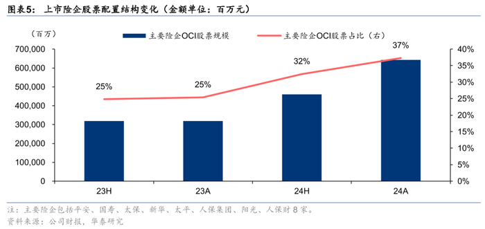 险资普遍加大红利股配置力度,银行为险资增持优选。一方面,随理财、存款、国债等各类核心资产定价进入持续下行通道,险资缺乏可提供长期稳定投资收益的优质资产,盈利能力稳定的高息股能够提供长期现金收益,缓解现金收益压力;另一方面,2023年起上市保险公司开始采用《金融工具》准则IFRS9,保险公司买入高息股并计入FVOCI有助于降低利润波动,带来高息股增配需求。新准则实施以来保险公司持续加大权益投资在OCI账户配置力度,主要上市保险公司的股票投资中OCI账户占比由23H1末的25%提升至2024年末的37%。而基于此收取股息、降低利润波动的红利策略,要求投资标的股息DPS稳定、估值合理、股息率较高,与盈利稳健、股息回报较高的银行股风格正好匹配。
