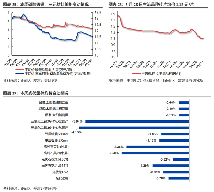 ■ 光伏:4月光伏新增装机量45.2GW,同比+214.7%。本周磷酸铁锂、三元材料价格为3.1万元/吨,11.6万元/吨;5月28日主流品种硅片及TOPCon电池片价格为1.12元、0.26元,延续降势。