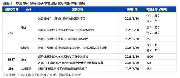 我们对中科院等离子体物理研究所2025年5月的招/投标数据进行统计,截止至5月30日,共21项招标项目,12项中标项目。近七日(0524-0530)新增招标项目7项,其中偏滤器1项,冷却系统1项。