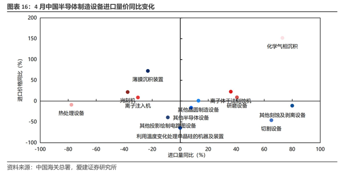 ■4月半导体设备进口量价数据:1)抛光、切割等设备领域,国产替代进展明显,进口价格显著下行;2)化学气相沉积、刻蚀剥离等先进制程强相关设备中,部分细分品类依旧保持高技术依赖。3)“光刻机”“离子注入机”等关键核心设备则呈现量降价增,主要受限于外部出口管制。