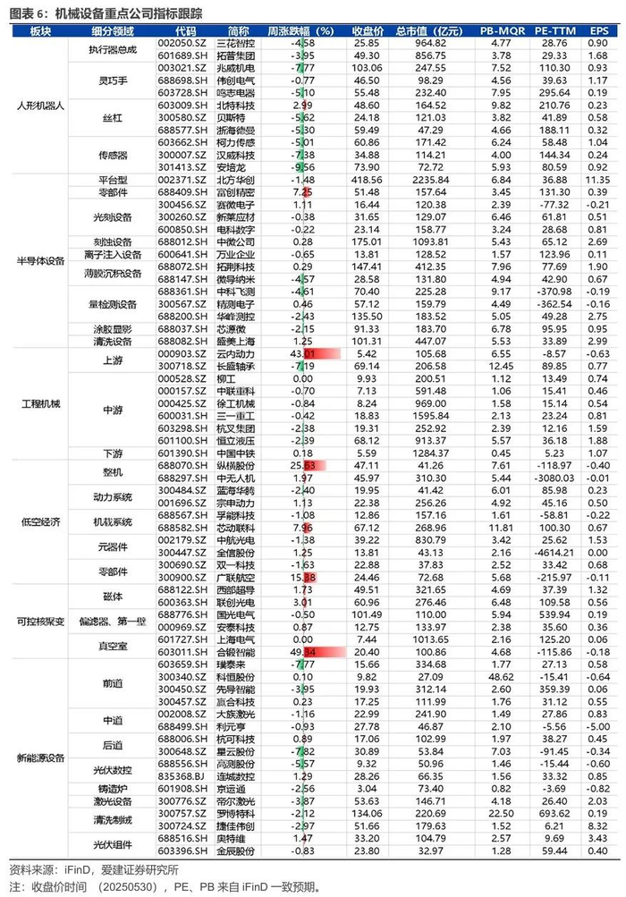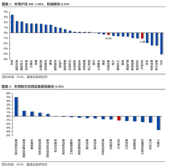 市场表现:本周(2025/5/26-2025/5/30)沪深300指数-1.08%,其中机械设备板块-0.43%,申万一级行业排名21/31位。机械设备子板块中,制冷空调设备表现最佳,涨幅为+5.00%。