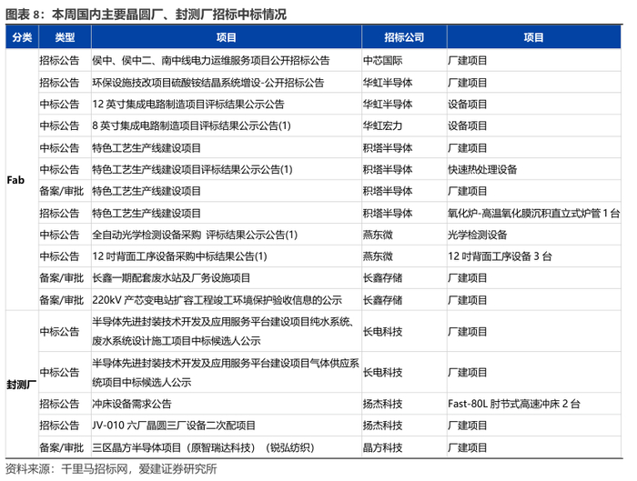我们选取国内主要晶圆代工厂和封测厂,统计设备及厂建招标中标情况:近7日(0524-0530)国内主流晶圆代工厂和封测厂公开披露17项招标、中标和备案审批公告。