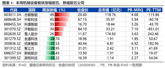 本周机械设备板块中,涨幅前五公司分别为合锻智能(+49.34%)、中邮科技(+45.98%)、科捷智能(+39.17%)、开勒股份(+30.59%)、雪人股份(+26.71%);跌幅前五公司分别为金道科技(-24.70%)、佰奥智能(-27.53%)、智立方(-29.95%)、新锐股份(-30.43%)、英特科技(-32.22%)。
