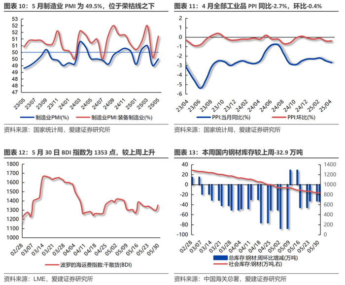 ■PMI:5月PMI为49.5%,位于荣枯线之下;装备制造业PMI为51.2%,位于荣枯线之上。从企业规模看,大、中、小型企业PMI分别为50.7%、47.5%、49.3%,较上月分别+1.5、-1.3、+0.6个百分点;从分类指数看,新订单指数、原材料库存指数、从业人员指数低于临界点,生产指数高于临界点,表明制造业企业生产边际改善,需求边际改善,制造业主要原料库存增多,用工景气度边际改善,制造业原材料供应商交货时间保持稳定。