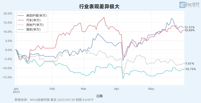 2025 年,在 A股赚钱,如果眼光好,似乎又不那么难。前五个月,不乏两位数涨幅的行业,比如美容,比如汽车。