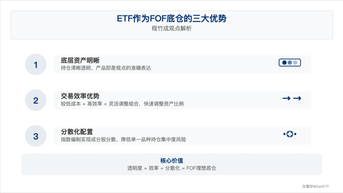 对于用 ETF 作为FOF 的底仓,程竹成认为有三大好处: