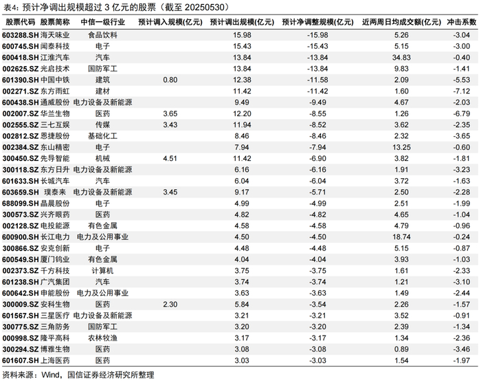 预计净调出规模超过3亿元的股票如下,其中海天味业、闻泰科技、江淮汽车等股票预计净调出规模较大,预计净调出规模分别达到15.98、15.43、13.84亿元。