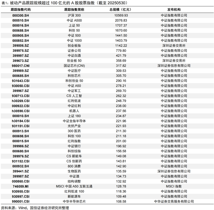 由于指数成分股调整是根据编制规则进行的被动操作,因此若成分股的调整规模较大,则可能带来交易性的投资机会。我们对跟踪不同指数的被动产品的规模进行了统计,仅考虑ETF、普通场外指数基金以及LOF,ETF联接不纳入考虑,其中,ETF规模截至2025年5月30日,场外基金以及LOF规模截至2025年3月31日。截至2025年5月30日,被动产品跟踪规模超过100亿元的A股股票指数共38只,其中跟踪规模前三的指数分别为沪深300、中证A500、科创50,跟踪规模分别为10569.93、2076.83、1707.37亿元。