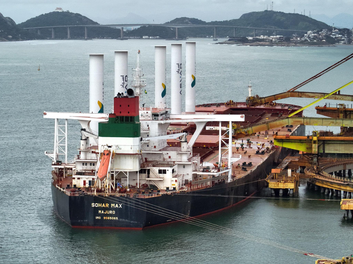 由于航运是我们“范围三”排放的另一个主要来源,2021年,我们发起“生态航运计划”,通过将尖端技术应用于公司租用船队,减少铁矿石航运过程中产生的碳排放。我们在这方面也与中国有着密切合作。一个很好的例子是 40万吨级矿砂船“Sohar Max”轮,它是世界上最大的装有风力推进系统的船舶之一。这艘船主要用于巴西与中国之间的铁矿石运输,去年已完成了五个旋翼帆的加装改造。这些旋翼帆能使船舶能效提高多达6%,每艘船每年因此可减少多达3000吨二氧化碳当量的排放。此次加装的旋翼帆由中国的船厂建造,并由中国的船厂完成加装改造。