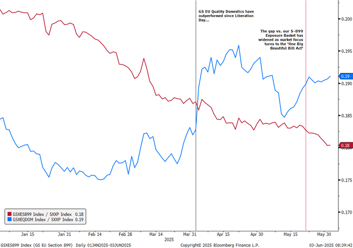 高盛建议:做空GSXES899,同时做多“欧洲优质内需股篮子”(GSXEQDOM)。自4月初以来,内需股相较于899风险敞口股持续跑赢,随着市场对“大漂亮法案”关注升温,表现差距进一步扩大。