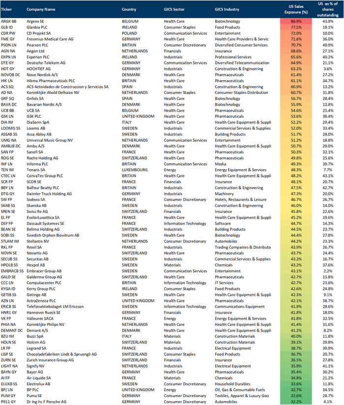 该篮子的构建标准为:公司在美销售占比平均约为48%;同时通过定性筛选剔除美国持股比例较高的企业(如CRH、Qiagen)。整体组合还针对流动性和可借证券情况进行了优化,单一成分股权重上限约为4%。