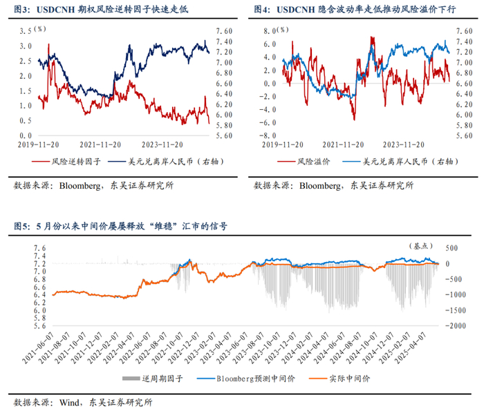 从当前资金押注的方向看,看涨人民币汇率的“一致性预期”正在形成。从外汇期权市场的风险指标来看,资金看涨人民币汇率的押注不断抬升,进入5月份美元兑人民币汇率隐含波动率持续走低:(1)度量价外看涨期权和价外看跌期权隐含波动率之差的指标即是风险逆转因子,风险逆转因子持续走低,显示市场资金在押注USDCNH汇价下跌,USDCNH价外看跌期权波动率随着买入需求增加而上升,截至5月28日收盘,押注USCNH升值方向的风险逆转因子报0.4025%,达到2024年7月以来最低水平;(2)从USDCNH期权隐含波动率与实际波动率之差,即风险溢价来看,由于隐含波动率下移,USDCNH期权“风险溢价”也在快速走低,显示资金认为人民币对美元低波动“补涨”的确定性更高。