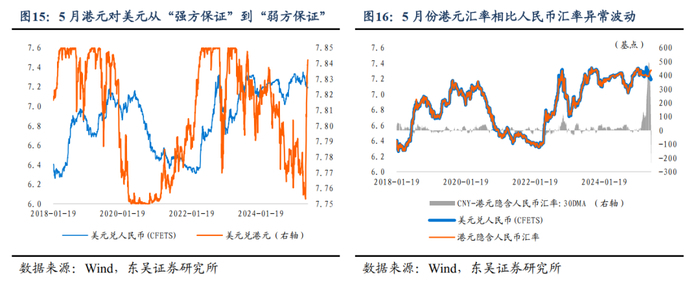 由于外资从2月份以来持续流入人民币金融资产,尽管由于4月下旬外资或开始减持人民币债券,导致4月份证券投资项目单月逆差16.83亿美元,但是2025年1-4月份证券投资结汇顺差仍达到25.91亿美元,并且4月下旬以来外资对人民币金融资产的风险偏好显著抬升。但是参考港元汇率5月份以来的走势,也从跨境资金层面警示在外汇市场波动率较高的时期,跨境资金的“快进快出”或增大宏观审慎管理的难度。