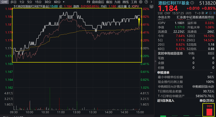 昨日(6月3日),港股红利ETF基金(513820)震荡攀升,收涨0.85%,全天溢价频现,收盘价再创历史新高!港股红利ETF基金(513820)最新单日吸金近1000万元。
