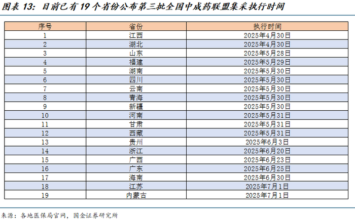 第三批全国中成药联盟集采和首批中成药联盟扩围接续采购中选结果公布后,各地陆续发布公告推动后续落地实施,据统计,目前已有19个省份(河南、山东、湖南、湖北、江西、浙江、江苏、福建、广东、海南、四川、贵州、云南、甘肃、青海、内蒙古、广西、新疆、西藏)明确第三批全国中成药联盟集采及首批中成药联盟扩围接续采购执行时间,多数在5月末以后执行,集采中选产品在三季度有望实现更多放量。建议继续关注剩余省份具体执行时间。