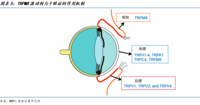 瞬时受体电位 (TRP) 通道将化学刺激和温度变化的信号从眼表传递到大脑。而干眼症 (DED) 是一种多因素疾病,患者眼睛对轻微刺激会产生异常感觉,例如干涩、视物模糊、异物感、不适、刺激和疼痛;TRP 通道功能障碍(即 TRPV1 和 TRPM8),可能与 DED 的病理生理学相关。下图展示了TRP通路的作用机制。