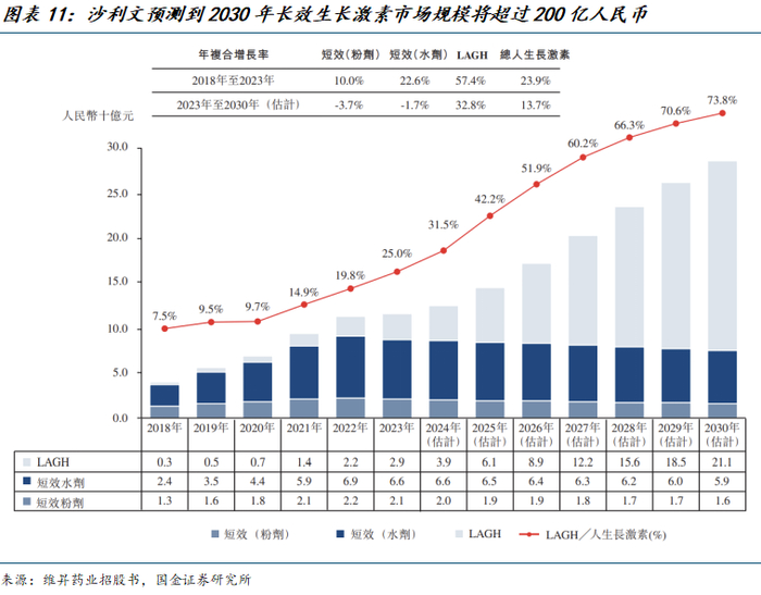 按给药频率,人生长激素疗法可分为短效和长效生长激素疗法,其中长效生长激素旨在减少注射次数,从而改善依从性及治疗效果。由于在提高患者接受度、耐受性及治疗灵活性方面的潜在显著优势,长效生长激素市场规模有望持续增长。