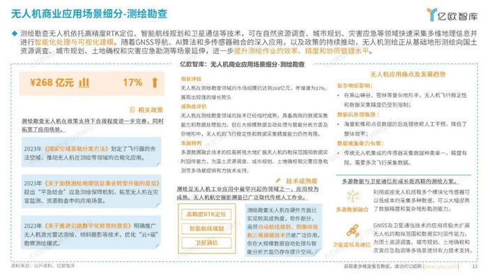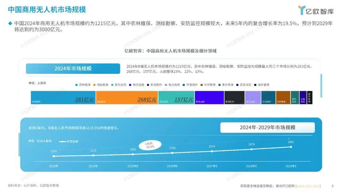 报告深入剖析了商业无人机的多种构型技术路线,涵盖固定翼、多旋翼和复合翼等类型,探讨了其技术成熟度与应用场景的匹配情况。2024年,中国B端无人机市场规模达1215亿元,农林植保、测绘勘察和安防监控占据前三,且预计未来5年将以19.5%的复合增长率持续扩大。