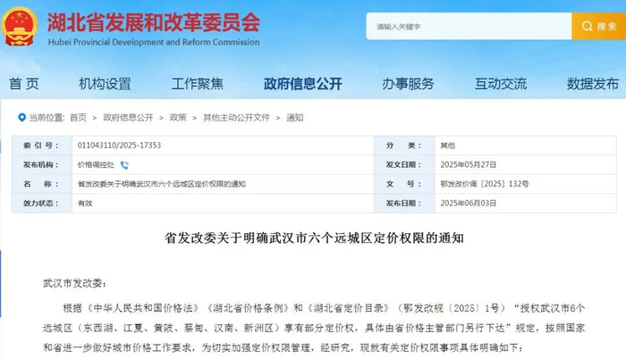 根据《中华人民共和国价格法》《湖北省价格条例》和《湖北省定价目录》(鄂发改规〔2025〕1号)“授权武汉市6个远城区(东西湖、江夏、黄陂、蔡甸、汉南、新洲区)享有部分定价权,具体由省价格主管部门另行下达”规定,按照国家和省进一步做好城市价格工作要求,为切实加强定价权限管理,经研究,现就有关定价权限事项具体明确如下: