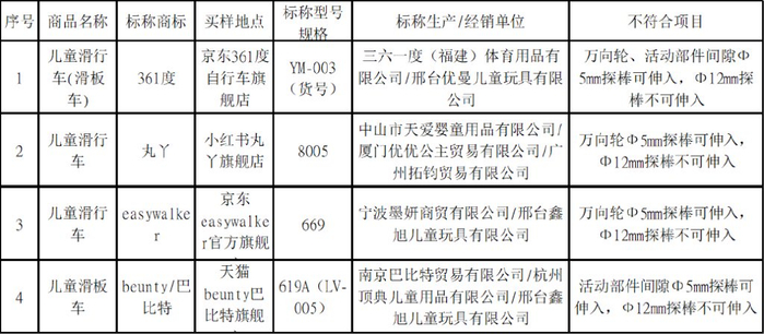 标称 “361度”牌儿童滑行车(滑板车)(货号:YM-003),不符合项目:万向轮、活动部件间隙中5mm探棒可伸入,12mm探棒不可伸入;