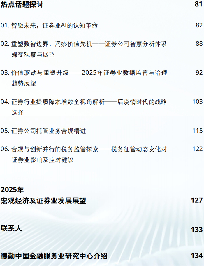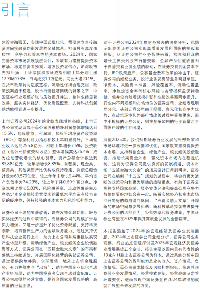德勤中国金融服务业研究中心近日发布《数智筑基 开放聚势:中国证券业2024年发展回顾及2025年展望》报告,涵盖了2024年宏观经济和证券业发展回顾、2024年上市证券公司业绩分析、业务观察、行业热点话题探讨及2025年宏观经济和证券业发展展望五个章节。