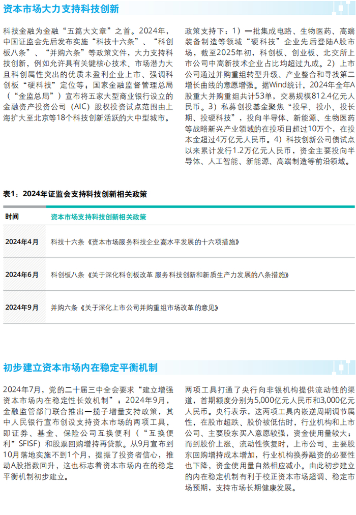 科技金融为金融“五篇大文章”之首。2024年,中国证监会先后发布实施“科技十六条”、“科创板八条”、“并购六条”等政策文件,大力支持科技创新,例如允许具有关键核心技术、市场潜力大且科创属性突出的优质未盈利企业上市、强调科创板“硬科技”定位等;国家金融监督管理总局(“金监总局”)宣布将五家大型商业银行设立的金融资产投资公司(AIC)股权投资试点范围由上海扩大至北京等18个科技创新活跃的大中型城市。