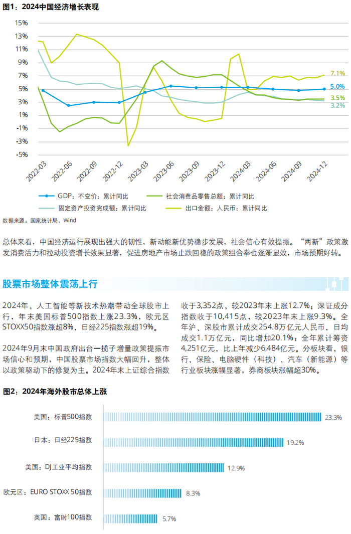 2024年,人工智能等新技术热潮带动全球股市上行,年末美国标普500指数上涨23.3%,欧元区STOXX50指数涨超8%,日经225指数涨超19%。