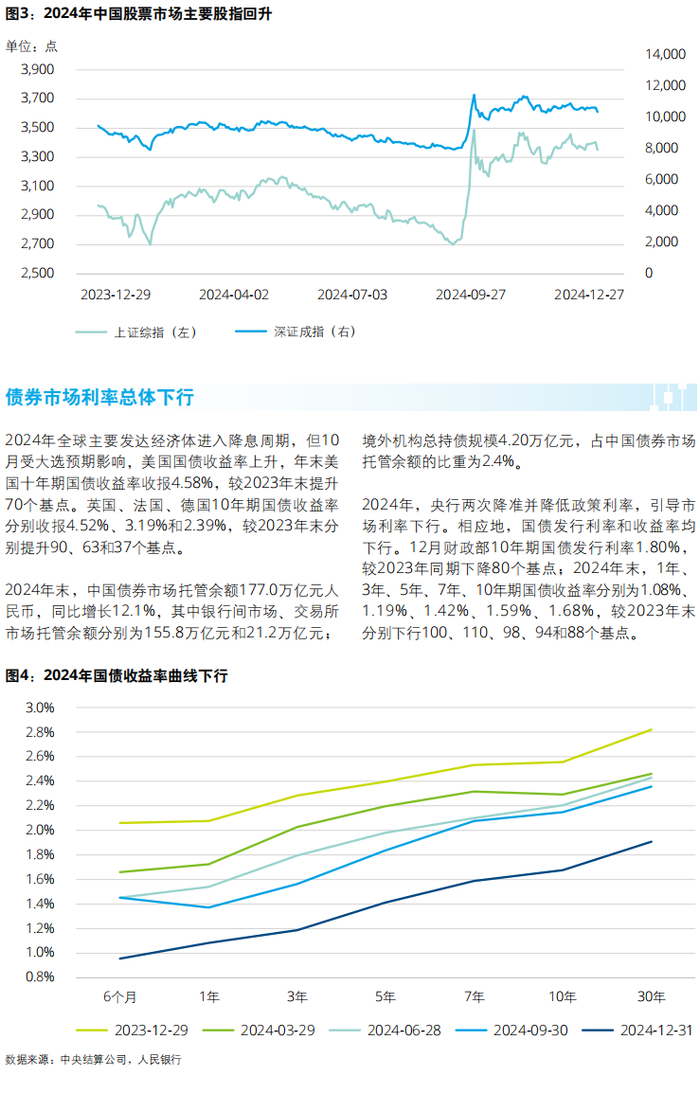 2024年9月末中国政府出台一揽子增量政策提振市场信心和预期,中国股票市场指数大幅回升,整体以政策驱动下的修复为主。2024年末上证综合指数收于3,352点,较2023年末上涨12.7%;深证成分指数收于10,415点,较2023年末上涨9.3%。全年沪、深股市累计成交254.8万亿元人民币,日均成交1.1万亿元,同比增加20.1%;全年累计筹资4,251亿元,比上年减少6,484亿元。分板块看,银行、保险、电脑硬件(科技)、汽车(新能源)等行业板块涨幅显著,券商板块涨幅超30%。