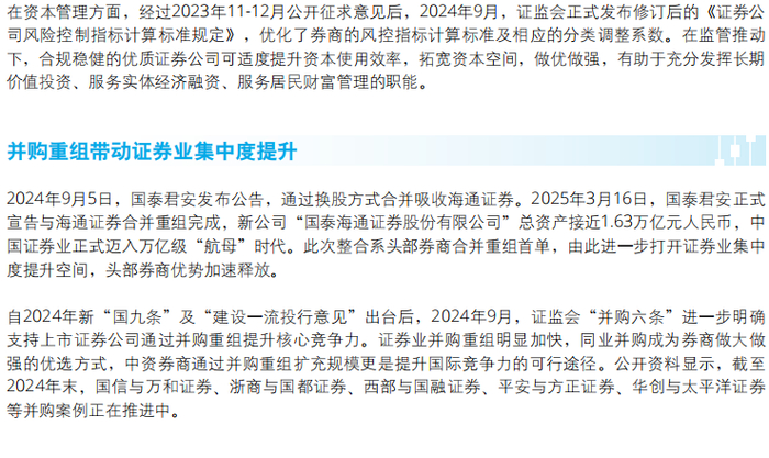 在资本管理方面,经过2023年11-12月公开征求意见后,2024年9月,证监会正式发布修订后的《证券公司风险控制指标计算标准规定》,优化了券商的风控指标计算标准及相应的分类调整系数。在监管推动下,合规稳健的优质证券公司可适度提升资本使用效率,拓宽资本空间,做优做强,有助于充分发挥长期价值投资、服务实体经济融资、服务居民财富管理的职能。