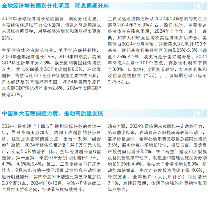 主要经济体经济复苏分化。美国经济保持韧性,2024年全年经济增长2.9%,2024年四季度,美国GDP环比折年率为2.3%;欧元区和英国经济增长乏力,欧元区四季度GDP同比增长0.9%,环比零增长,需求低迷和工业生产疲软是主要制约因素;日本经济复苏基础尚不牢固,2024年第四季度日本实际GDP环比折年率为2.8%,2024年实际GDP微增0.1%。
