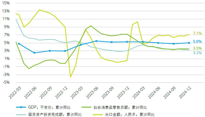 2024年是实现“十四五”规划目标任务的关键一年。面对外部压力加大、内部困难增多的复杂形势,我国加大宏观调控力度,出台一系列“组合拳”政策,2024年经济总量达到134.9万亿元人民币,实现5.0%的增长目标。全年经济增长呈U型走势:第一至第四季度GDP分别同比增长5.3%、4.7%、4.6%和5.4%;第二、三季度经济下行压力较大,9月末出台的一揽子增量政策组合带动经济运行明显回升,第四季度GDP增速比第三季度加快0.8个百分点。2024年10-12月,制造业PMI连续三个月位于扩张区间,经济景气度持续提升。